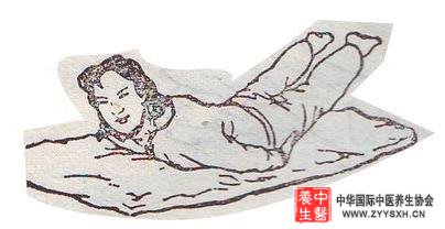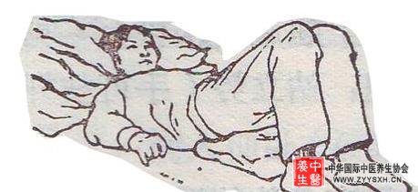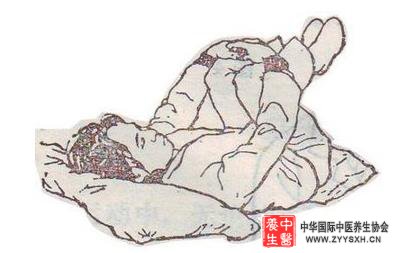 (2)仰卧沉腰法:病人仰卧在高枕上,臀尾骨部垫一个枕头,双腿屈在胸前,双手抱住,腰部自然下沉十五分钟以上。这种姿势可以使腰椎后缘间隙增大,利用韧带的动力,把突出的骸核推入椎间盘间隙内。
