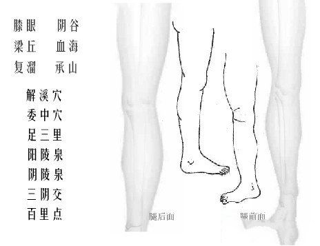 位置:小腿后面正中线,委中穴直下8寸,小腿腓肠肌两肌腹下方之间凹陷处。