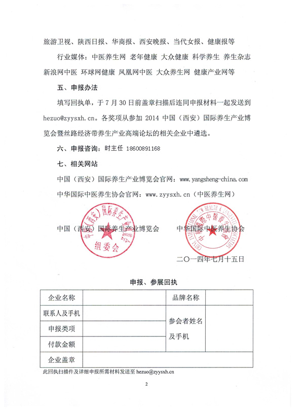 填写回执单,于7月30日前盖章扫描后连同申报材料一起发送到hezuo@zhongyi.bj.cn。各奖项从参加2014中国(西安)国际养生产业博览会暨丝路经济带养生产业高端论坛的相关企业中遴选。